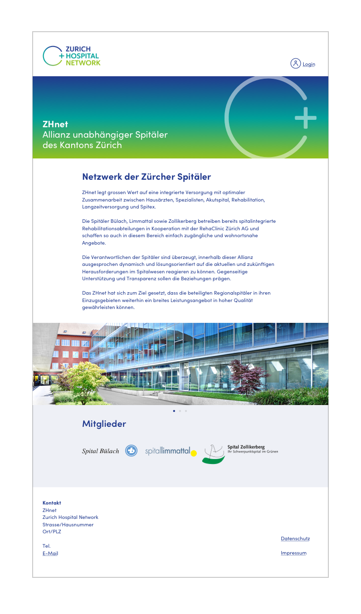 Als Gestaltungselement kann der ZHnet-Farbverlauf (Blau–Türkis–Hellgrün) eingesetzt werden. Das Logoelement (Kreis+) wird dabei angeschnitten und in einer Deckkraft von 50% platziert.